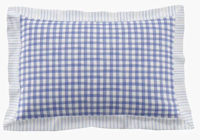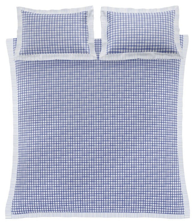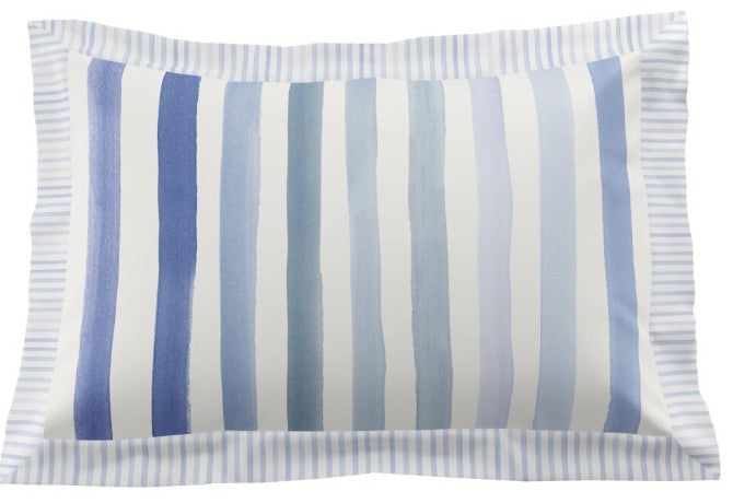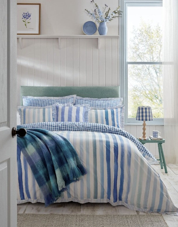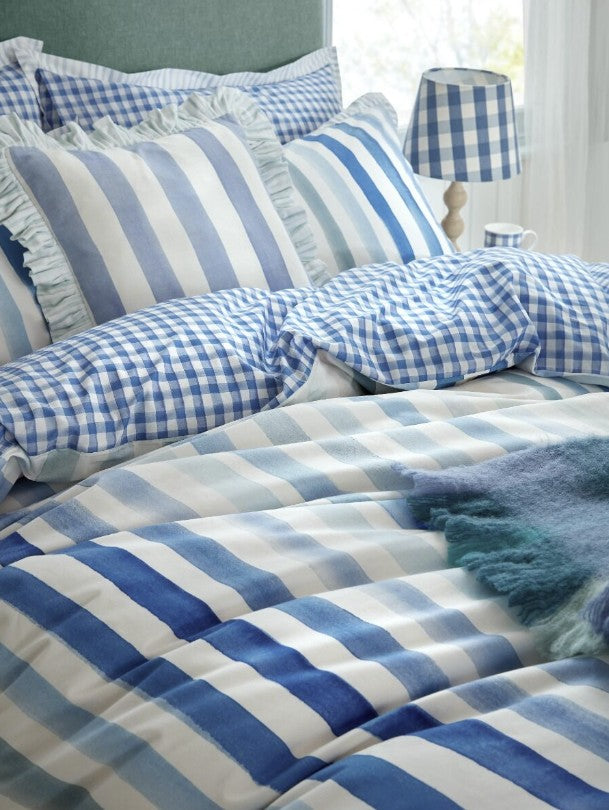 Sunday Stripe Blue Bedding - An artistic twist on a timeless classic, the Sunday Stripe duvet set is hand painted in tonal shades of soft, watery blue. The painterly stripes have a relaxed, fluid feel – a fresh, artistic take on the classic pyjama stripe, perfect for capturing the mood of a lazy Sunday morning. Finished with a smart contrast Oxford edge, the design reverses to a watercolour gingham, giving you two beautiful ways to style your bed. Printed onto soft 200TC Cotton percale