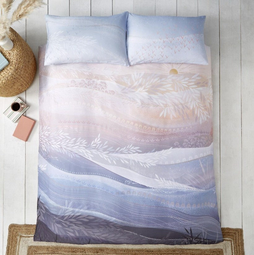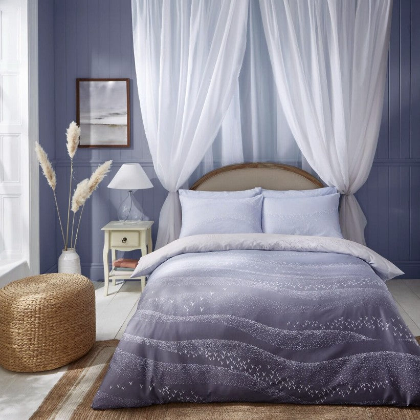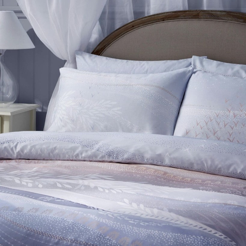 Coastal Dawn Blue Blush Bedlinen - Bring an uplifting tranquillity to your bedroom with this Coastal Dawn Bed Linen set from Sara Miller London, printed on plush 220 thread count 100% cotton sateen with a coordinating reverse. From waves of deep inky blues to delicate clouds of starlings bathing in the first rays of sunrise, the calming blue-blush ombre shades will make a stunning addition to your space.