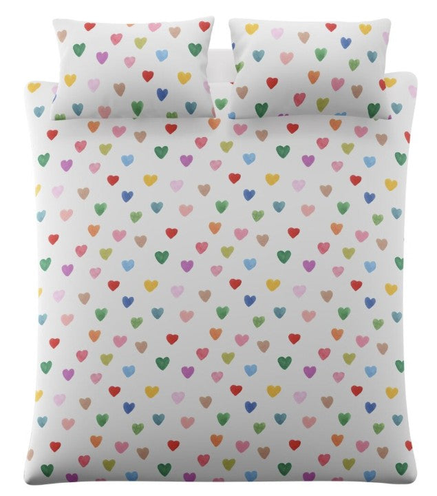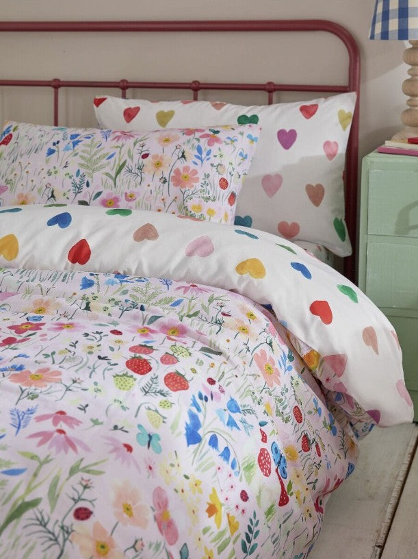 Secret Garden Bedding - Step into your very own joyful secret garden, with delicate bluebells, fluttering butterflies, juicy strawberries, and fresh foliage. We think there is a ladybird hiding in there too! As free spirited as your child, this is the design for those little ones who love to pick flowers and run wild and free. The second design of this fully reversible duvet cover features colourful love hearts that add a touch of love, fun and playfulness to your child’s bedroom - it captures that special “love you” feeling when you tuck them into bed at night. In a gorgeous palette of soft pink with delicate hints of cornflower blues, strawberry reds and sunny yellows. Printed onto a natural white 100% cotton. Wee Blue Bell is an independent design studio in Scotland, dedicated to creating colourful, joy-filled designs that are loved by children and grown-ups alike - designed to be age-neutral and lasting, so they grow happily with your little one.