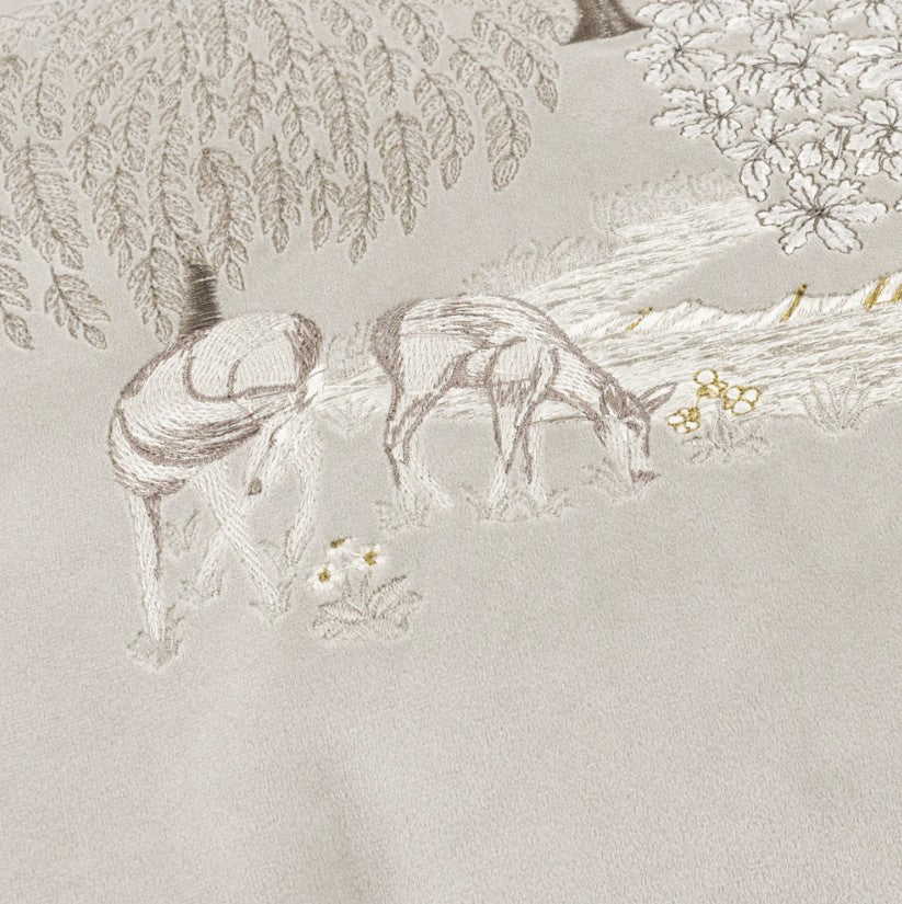 - Featuring a stunning woodland scene with deer and delicate embroidery on a matte velvet fabric.