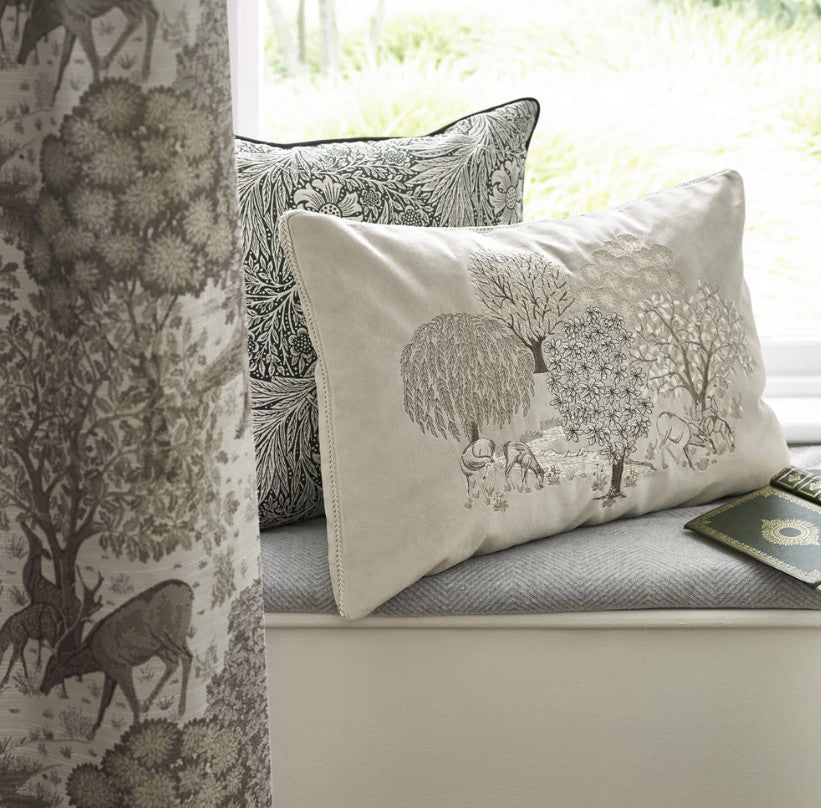 The Brook cushion is a tribute to Morris's belief in tapestry as the pinnacle of decorative art. Drawing inspiration from J.H. Dearle’s 'The Brook Tapestry' and the friezes beneath the Holy Grail Tapestries, this jacquard design captures the crispness and exquisite detail of medieval tapestries. This cushion features a central motif of deer by a babbling brook, enhanced with intricate embroidery on a matte velvet fabric. Finished with an inlaid braid trim, the Brook cushion elegantly combines classic artistry with a contemporary touch, adding timeless beauty to any home.